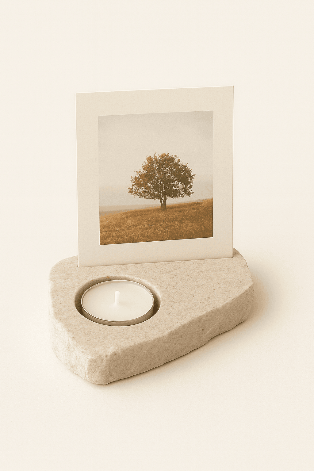 Een unieke natuurstenen houder voor een foto en waxinelichtje. Een kleine herdenkingsplek dat warmte, licht en herinnering samenbrengt in huis.