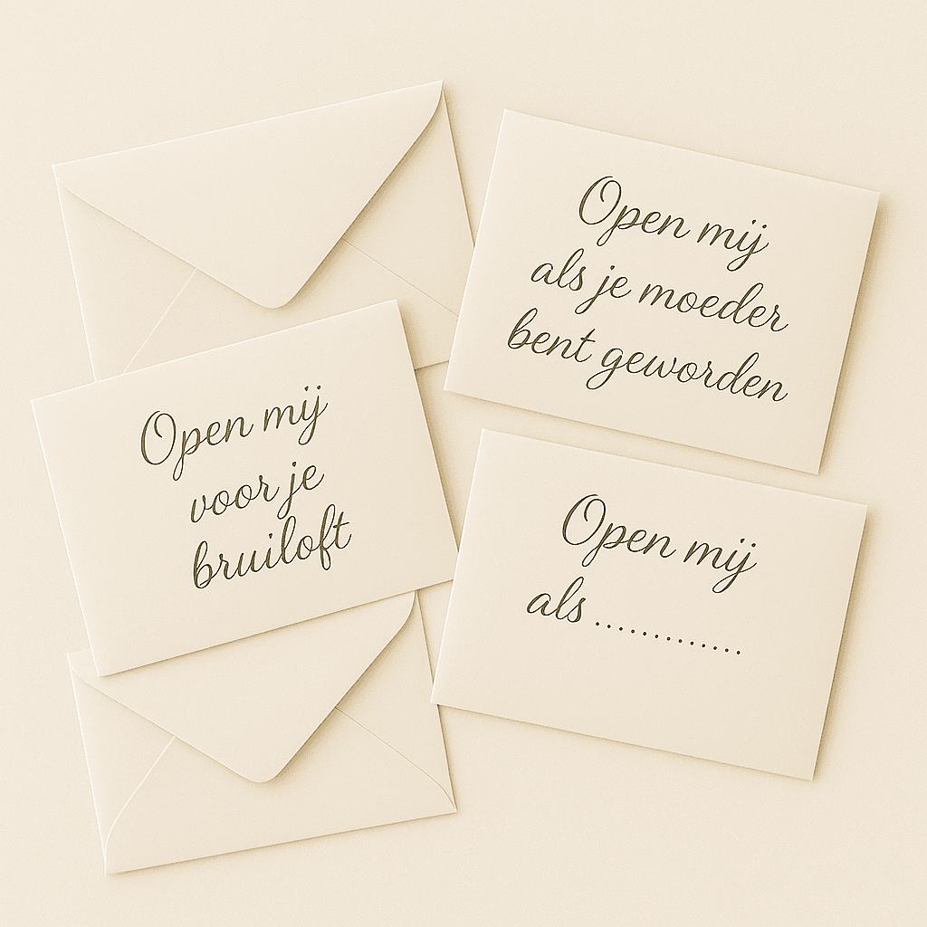 Boodschappen voor later. Deze enveloppen met opdrukken als ‘Open als je gaat trouwen’ bewaren jouw woorden tot het moment dat ze het meest nodig zijn.